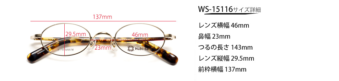 ・Wabi Sabi WS-15116サイズ詳細:小さめ玉型のオーバルタイプフレームです。